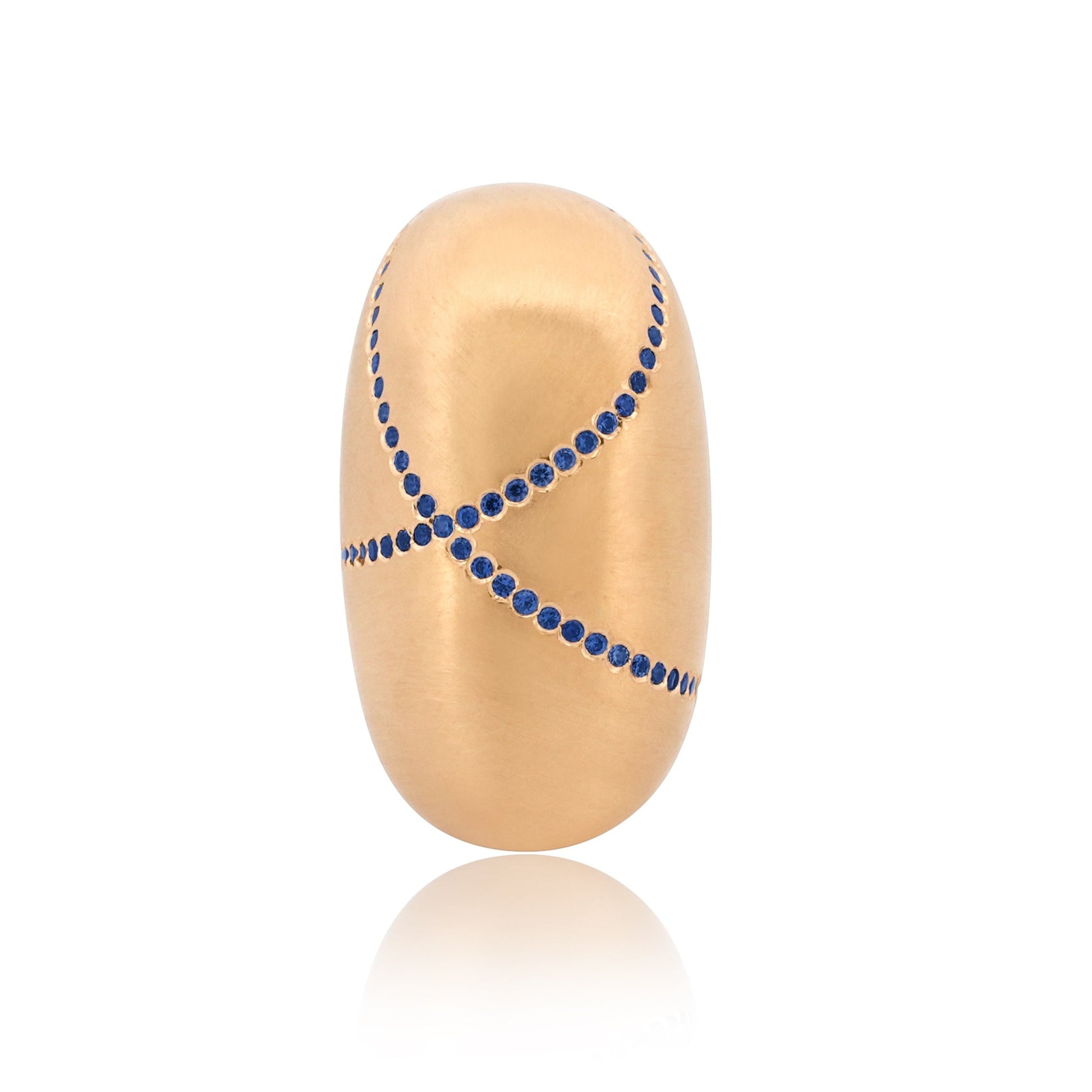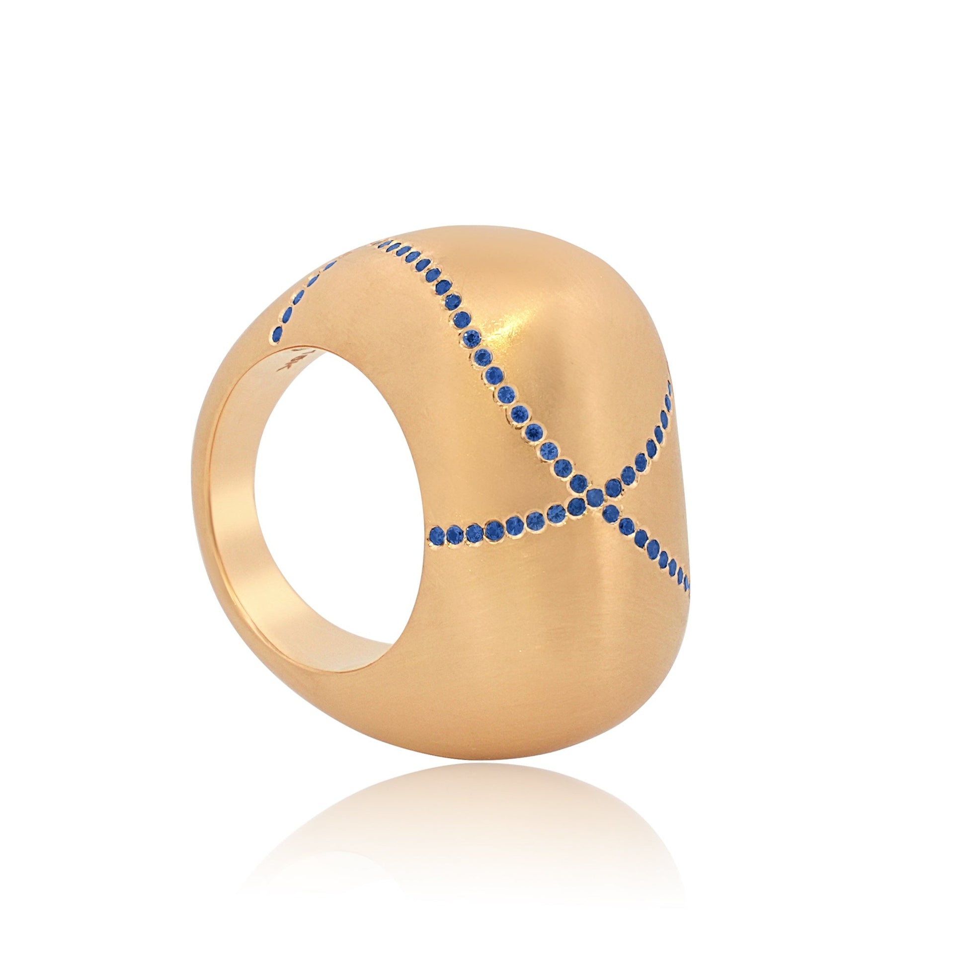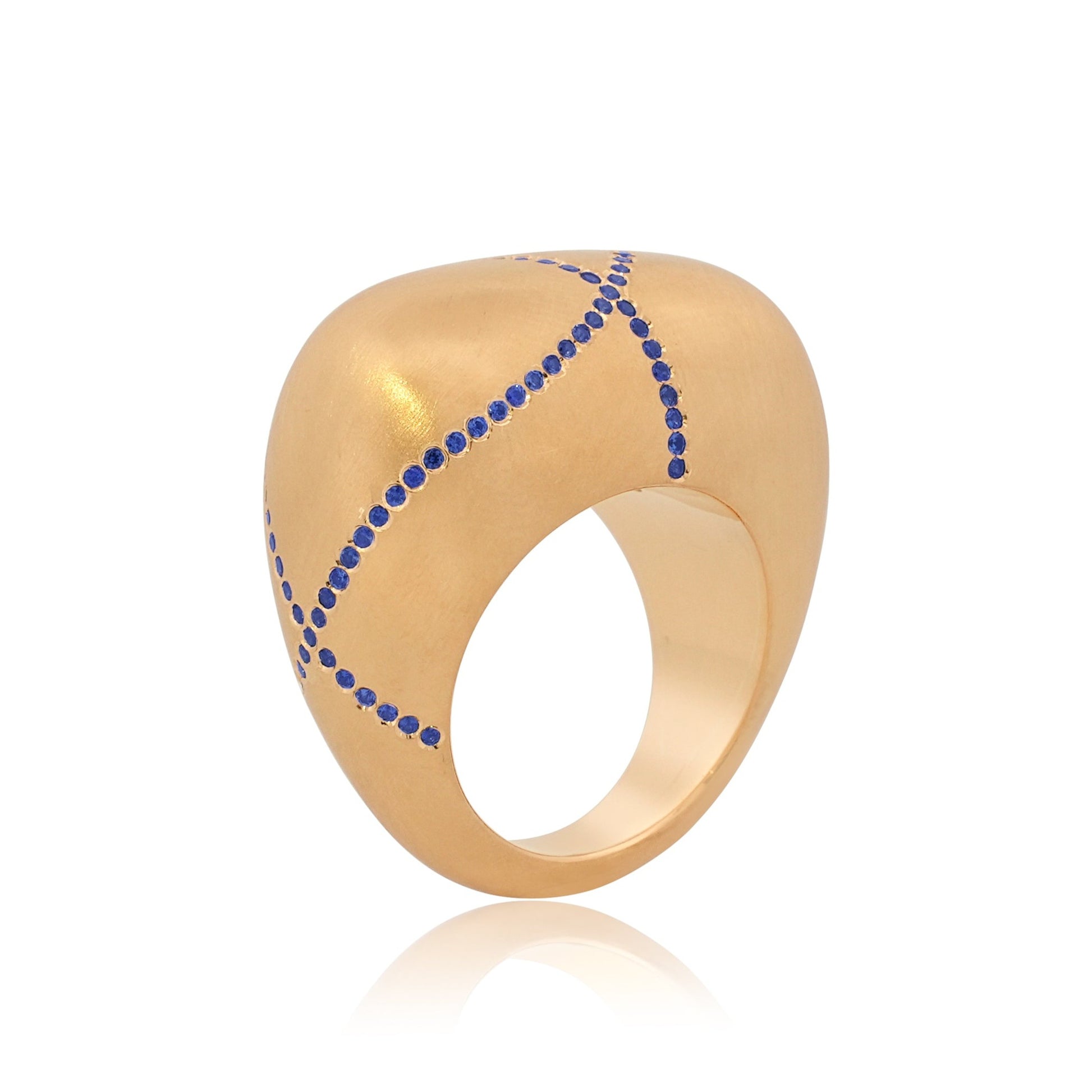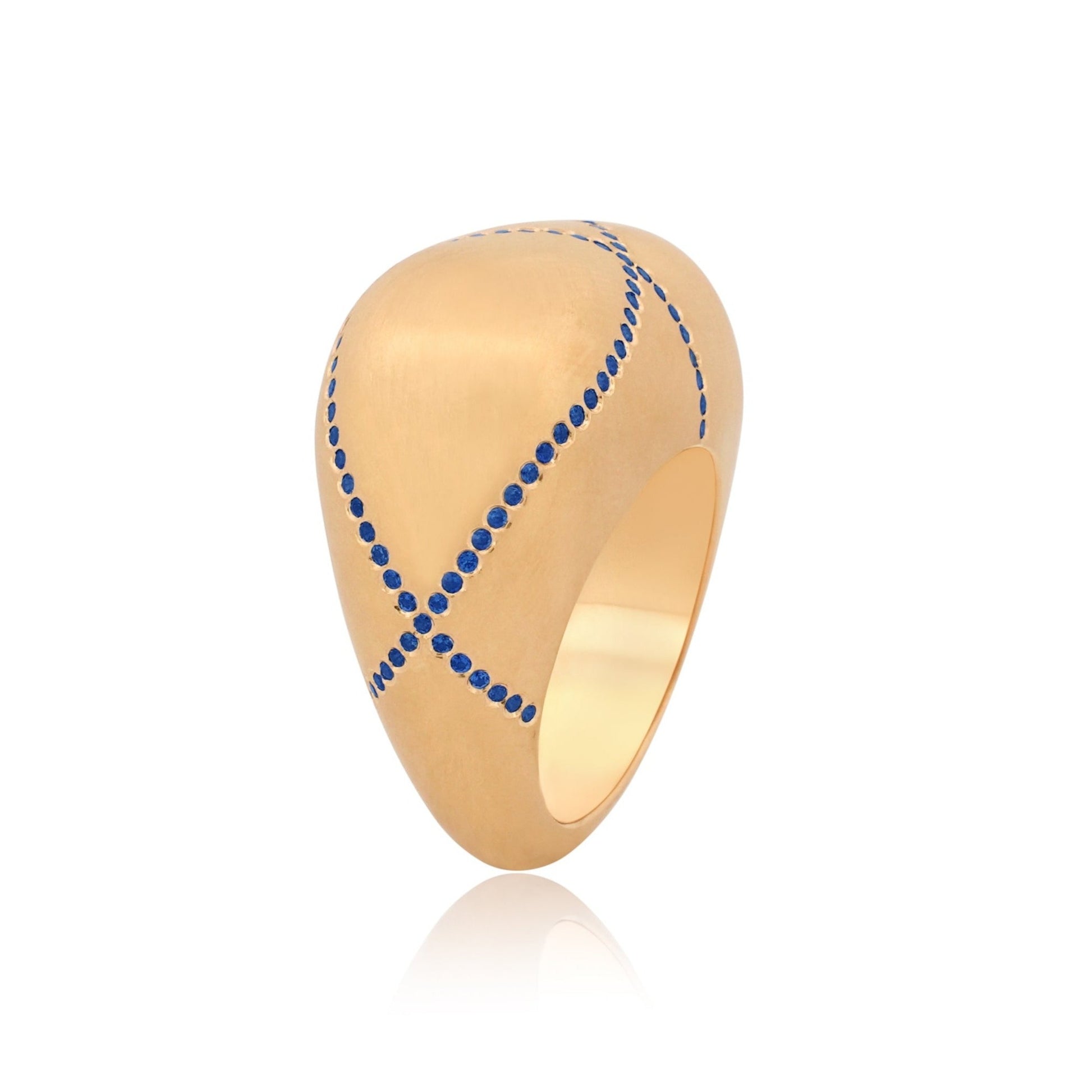 Ring No. 1 LE—the ring that started it all and is poised to become a modern classic is elevated to one of a kind status. Crafted in 18k yellow gold and natural sapphire this piece is a stand out design. Its chic domed silhouette sets the trend with our signature glowy GMI matte finish, offering a soft, dreamy appearance that pairs effortlessly with everything. The one of a kind pattern drawn in gemstones makes it a very special piece. Designed for unparalleled comfort, it's a staple for the new age and could very well be the only piece of jewelry you will ever need—and always be remembered for wearing.